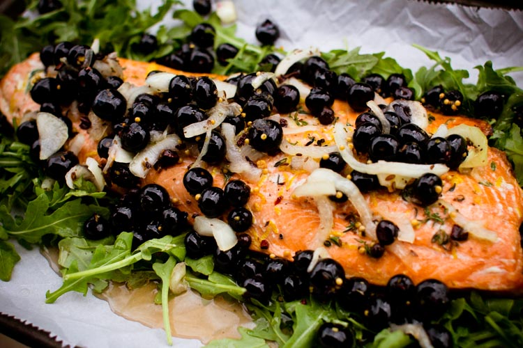 Blueberries, huckleberry, elderberry, and wild raspberries all grow in Tlingit territory. Each will give the dish a slightly different flavor, but really, you can't go wrong with fresh berries.
