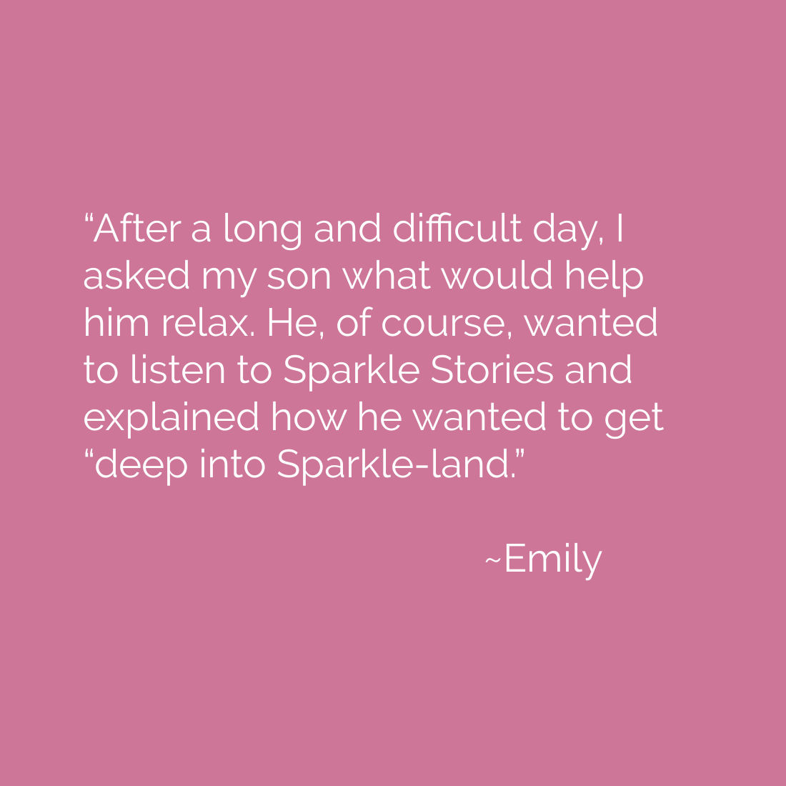 “After a long and difficult day, I asked my son what would help him relax. He, of course, wanted to listen to Sparkle Stories and explained how he wanted to get “deep into Sparkle-land.” ~Emily