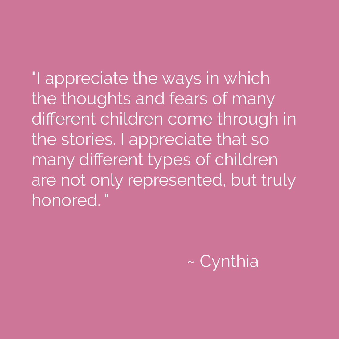 I appreciate the ways in which the thoughts and fears of many different children come through in the stories. I appreciate that so many different types of children are not only represented, but truly honored. ~ Cynthia