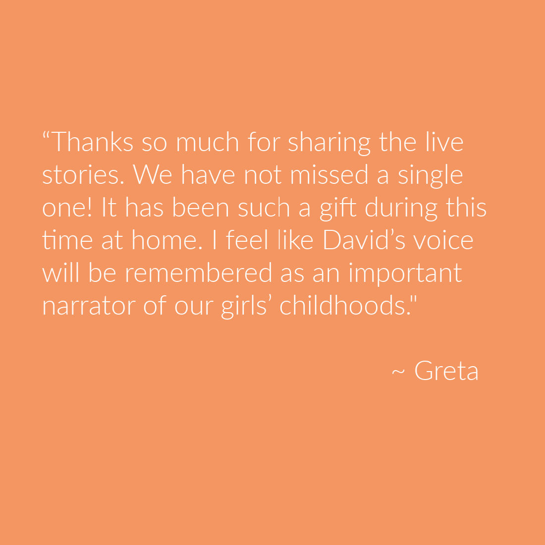 “Thanks so much for sharing the live stories. We have not missed a single one! It has been such a gift during this time at home. I feel like David’s voice will be remembered as an important narrator of our girls’ childhoods. ~Greta