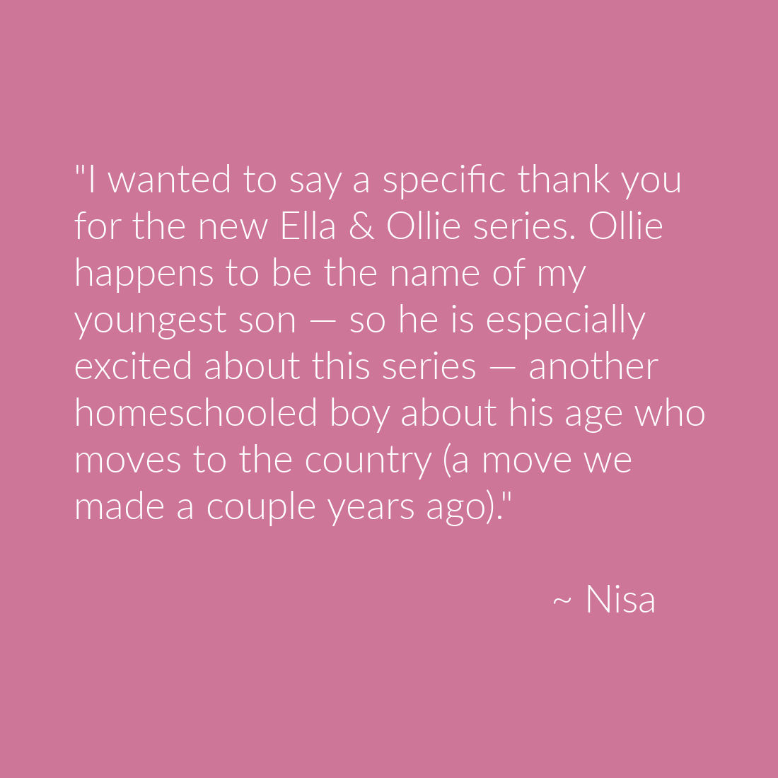 I wanted to say a specific thank you for the new Ella & Ollie series. Ollie happens to be the name of my youngest son — so he is especially excited about this series — another homeschooled boy about his age who moves to the country (a move we made a couple years ago). ~ Nisa