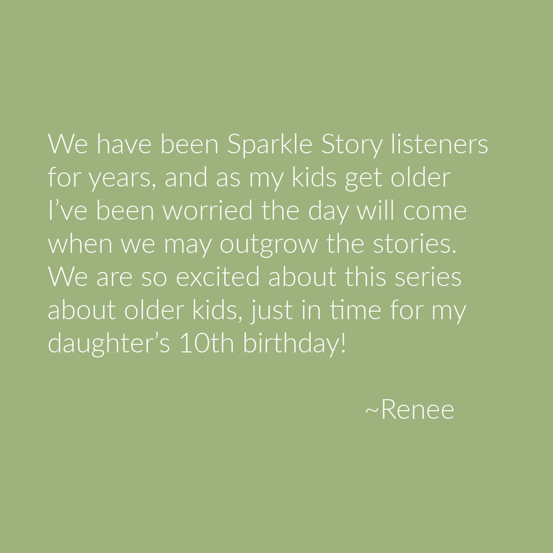 We have been Sparkle Story listeners for years, and as my kids get older I’ve been worried the day will come when we may outgrow the stories. We are so excited about this series about older kids, just in time for my daughter’s 10th birthday! ~Renee