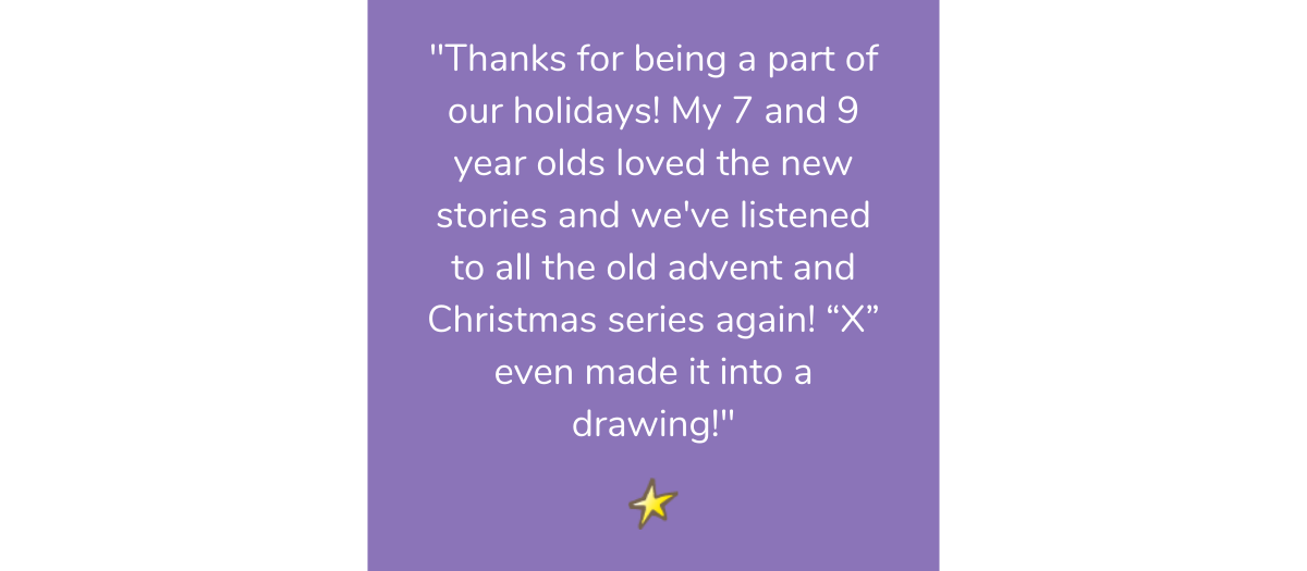I just had to quickly drop you a line to thank you sincerely for the *Libby & Dish Good-Deed-a-Day* stories. They were a wonderful addition to our advent tradition (thanks to your original *Martin & Silvia Audio Advent Calendar* we now are blessed with 24 days of "Advent Magic" in our house) and gave us three stories to listen to every day!