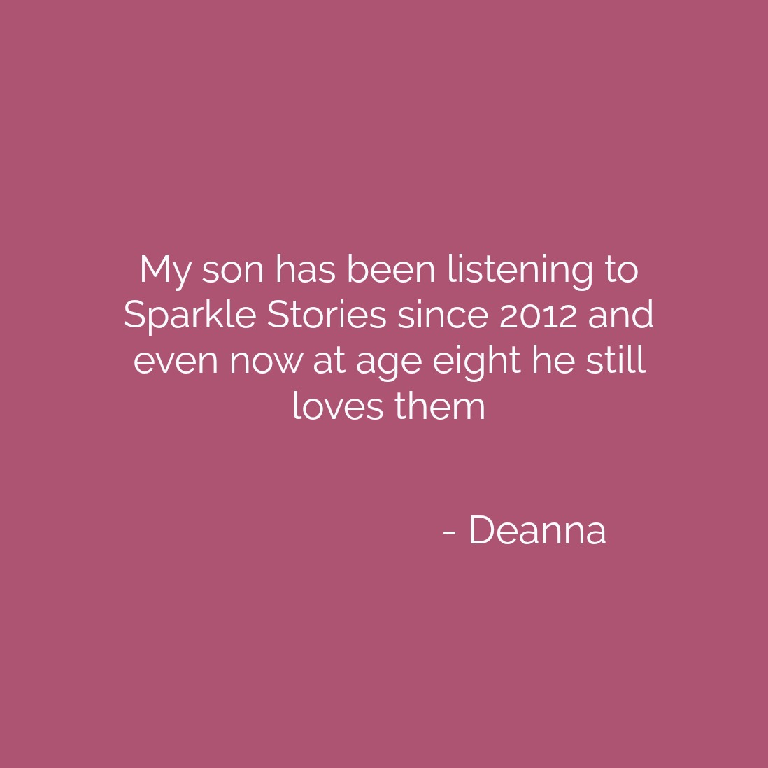 My son has been listening to Sparkle Stories since 2012 and even now at age eight he still loves them. ~Deanna
