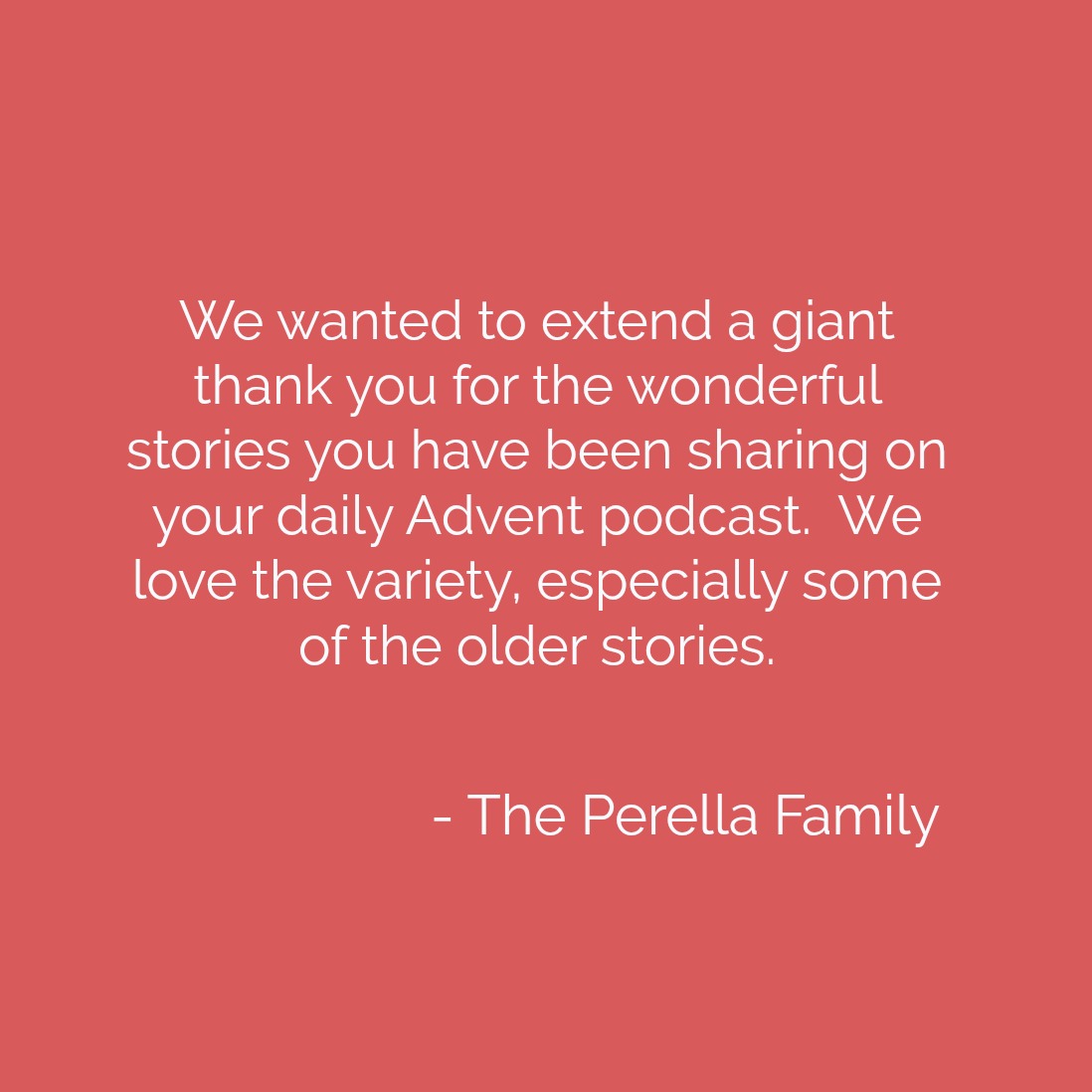 We wanted to extend a giant thank you for the wonderful stories you have been sharing on your daily Advent podcast. We love the variety, especially some of the older stories ~ The Perella Family