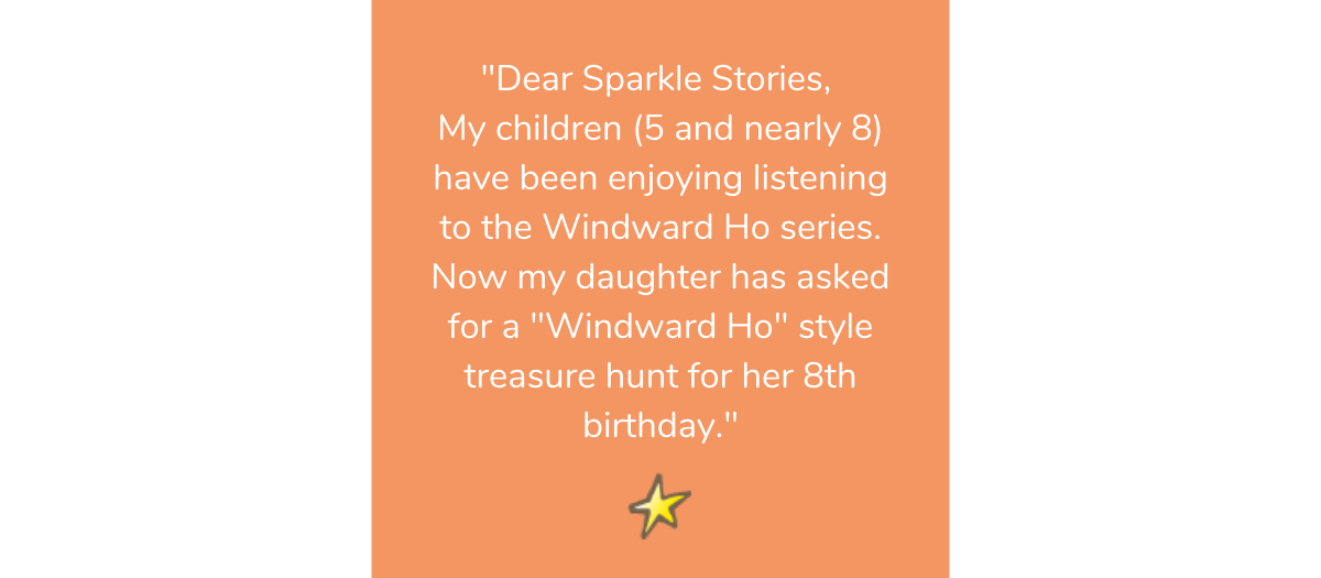 “Dear Sparkle Stories,My children (5 and nearly 8) have been enjoying listening to the Windward Ho series. Now my daughter has asked for a “Windward Ho” style treasure hunt for her 8th birthday.”