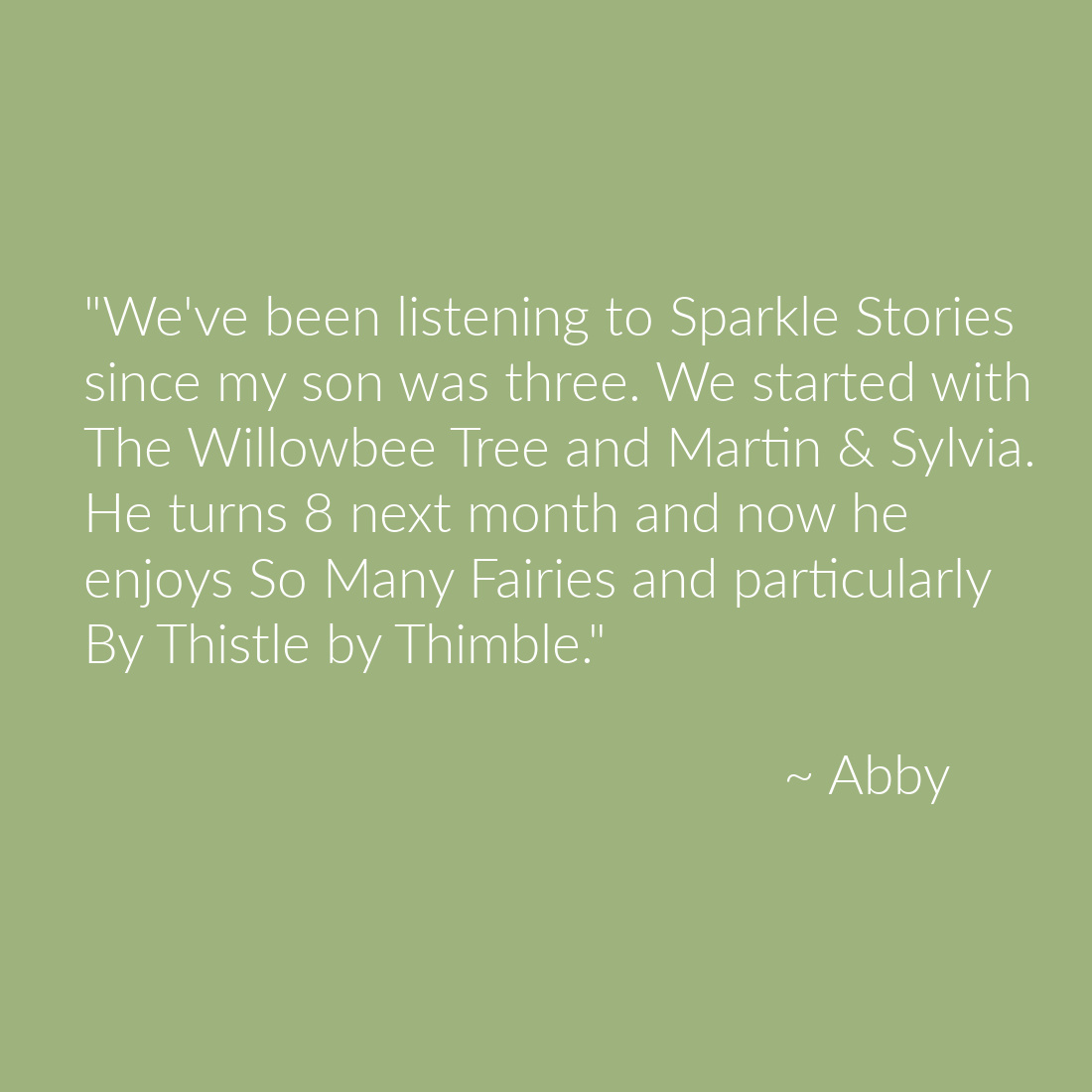 We’ve been listening to Sparkle Stories since my son was three. We started with The Willowbee Tree and Martin & Sylvia. He turns 8 next month and now he enjoys So Many Fairies and particularly By Thistle by Thimble.