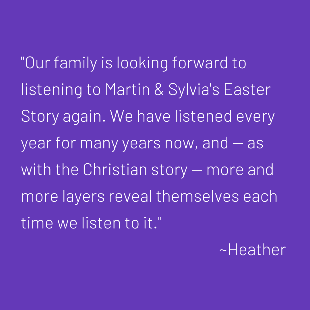 “Our family is looking forward to listening to Martin & Sylvia’s Easter Story again. We have listened every year for many years now, and — as with the Christian story — more and more layers reveal themselves each time we listen to it.”