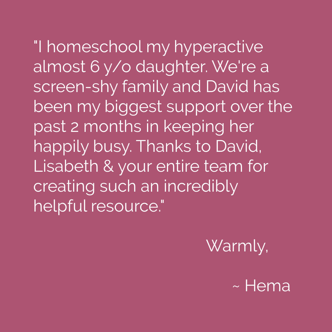 I homeschool my hyperactive almost 6 y/o daughter. We’re a screen-shy family and David has been my biggest support over the past 2 months in keeping her happily busy. Thanks to David, Lisabeth & your entire team for creating such an incredibly helpful resource.
