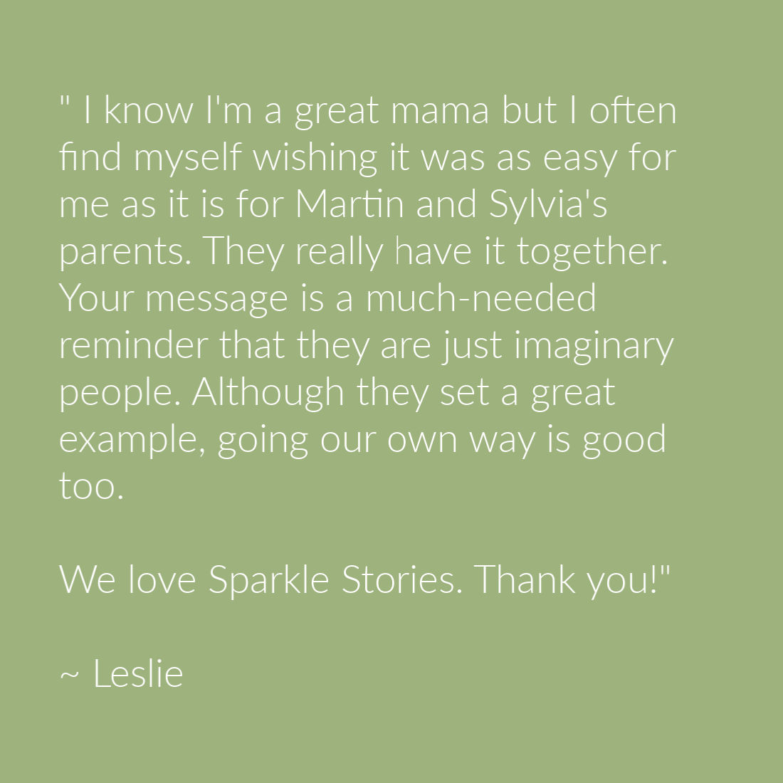 “Thank you for this message, Lisabeth. I know I’m a great mama but I often find myself wishing it was as easy for me as it is for Martin and Sylvia’s parents. They really have it together. Your message is a much-needed reminder that they are just imaginary people. Although they set a great example, going our own way is good too.