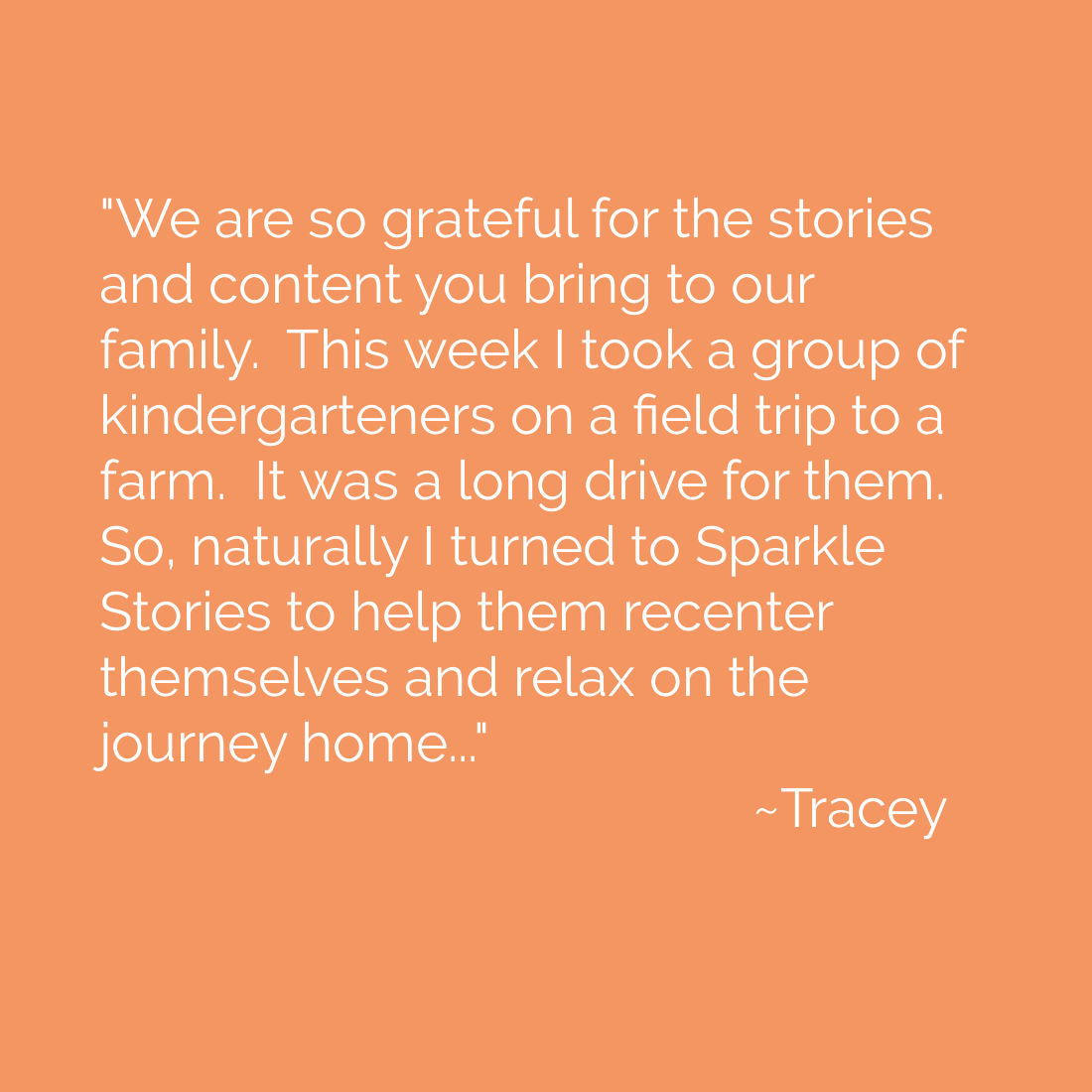 “We are so grateful for the stories and content you bring to our family.This week I took a group of kindergarteners on a field trip to a farm.It was a long drive for them.So, naturally I turned to Sparkle Stories to help them recenter themselves and relax on the journey home.We listened to the story, “The Orchardman and the Scarecrow.”You could hear a pin drop in my car with the seats full of wiggly, tired, excited, and hungry five year olds.It was amazing and really special.And of course when they found out it was the scarecrows a few of them shouted, “I knew it!”