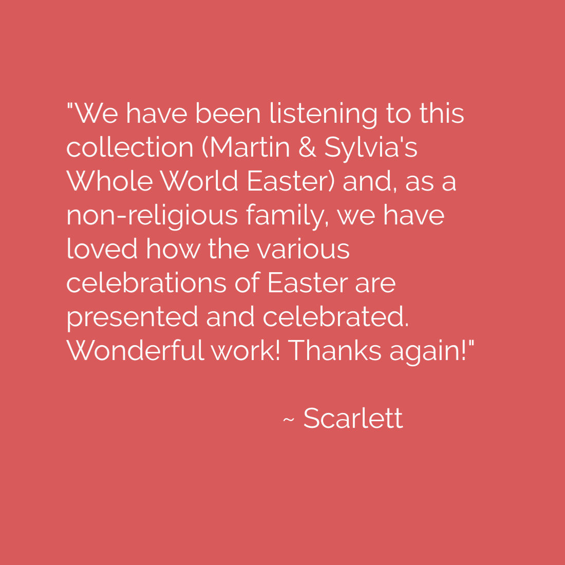 We have been listening to this collection (Martin & Sylvia’s Whole World Easter) and, as a non-religious family, we have loved how the various celebrations of Easter are presented and celebrated. Wonderful work! Thanks again!