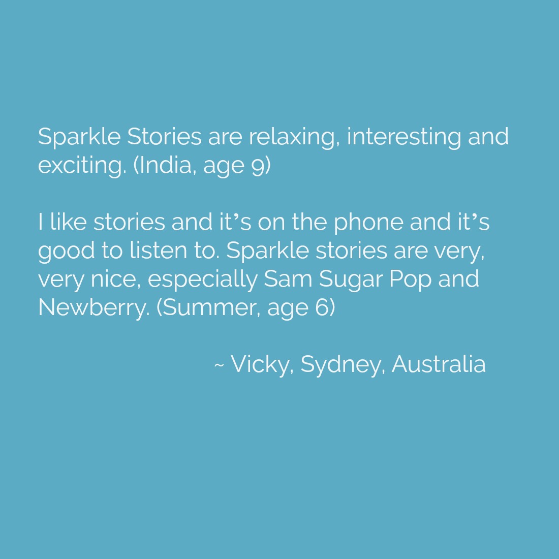 I like stories and it’s on the phone and it’s good to listen to. Sparkle stories are very, very nice, especially Sam Sugar Pop and Newberry. (Summer, age 6)