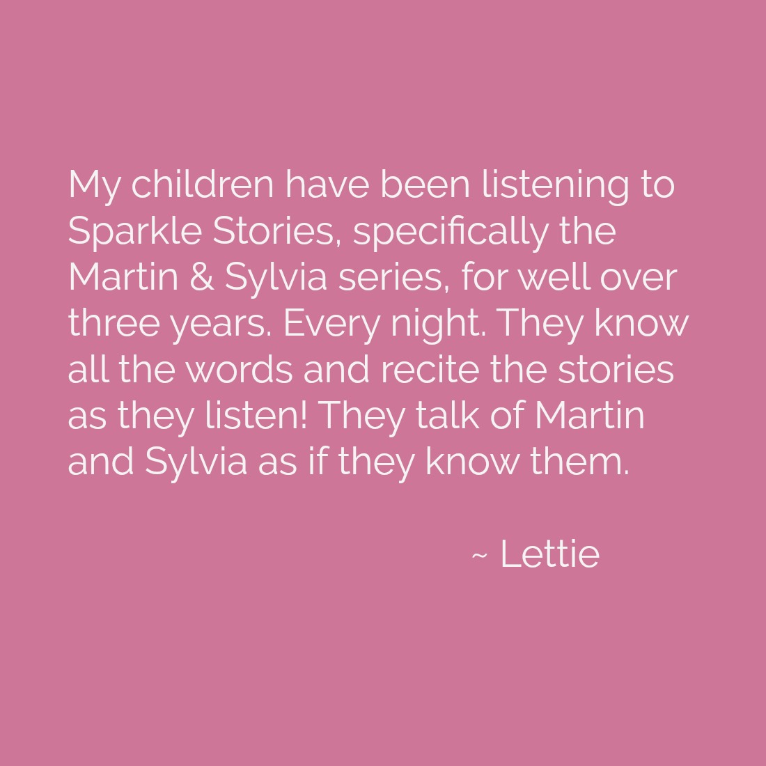 My children have been listen to Sparkle Stories, specifically the Martin & Sylvia series, for well over three years. Every night. They know all the words and recite the stories as they listen! They talk of Martin and Sylvia as if they know them. My daughter even once said, “I feel like they are friends who live far away who we should visit more.” Now, how many stories can evoke such wonder? Thank you! 🙂