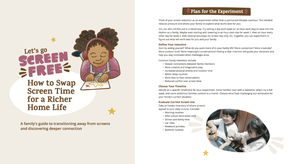 The best part? There’s no one-size-fits-all approach here. Whether your family dips a toe in with a single screen-free afternoon or goes all-in for a full week, the guide is designed to flex with you. Start small, celebrate the wins, and don’t stress about perfection — this is about discovering what your family loves to do when the default answer isn’t “let’s watch something.”
