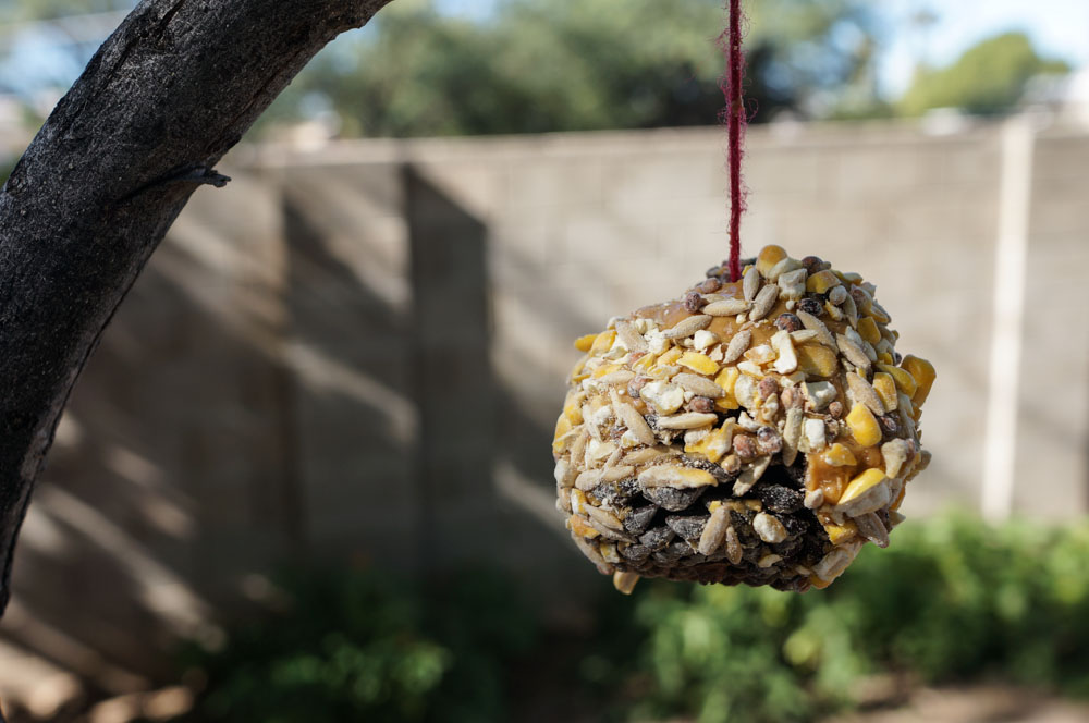Martin and Syvlia have lots of birds and squirrels in their backyard. We live in the desert and don’t have a lot of squirrels, but we do have lots of birds. In the dry seasons it’s very hard for the birds to find things to eat, just like it is in colder regions when everything is covered in snow. You don’t have to buy a fancy bird feeder to help out our furry and feathered friends. You can make your own! With a few simple ingredients and 5 minutes you’ll have your own bird or squirrel feeder.