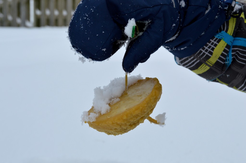 Now head outside with your wick and melted beeswax. Create your hole in the snow, we used a mason jar; place the wick into the center of the hole with the popsicle stick supporting the wick over the hole.