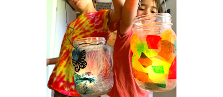 This craft is fun for all ages and the resulting lantern can be as abstract or detailed as the artist making it desires. There is no wrong way to do it — rip the paper or cut it into shapes. Heavily layer the paper or create a symmetrical design. Add items from nature like dried leaves, flowers, or feathers along with the paper.