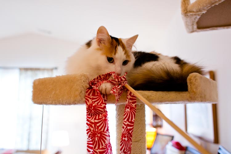 Dangle the fabric strips above your cat’s head for her to paw at or slowly trail them across the ground in front of her until she pounces after them. When the fabric strips start to get frayed, you can snip them off the dowel rod and start over again. Have fun!