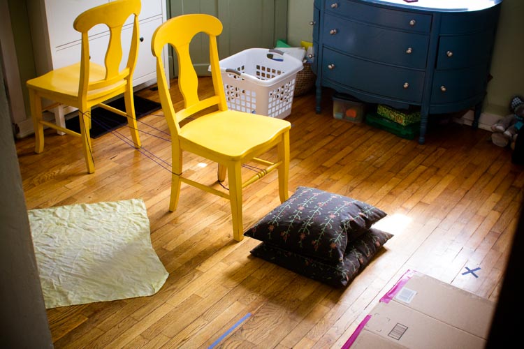 Near that line, set up two sturdy chairs and string several lengths of yarn between their legs. Just past the chairs, spread out the play silk, then make another long line with the painter’s tape. At the end of the line, pile up your pillows. Now you’re ready to go!