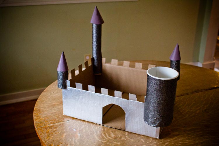 You can use either paint or duct tape to make the castle grey, or you can mix it up and use a little of both. (For our castle, we used paint on the main part of the castle and special glitter duct tape for the towers.) You could also draw rocks, bricks, or moss on the castle walls to add a bit of whimsy.
