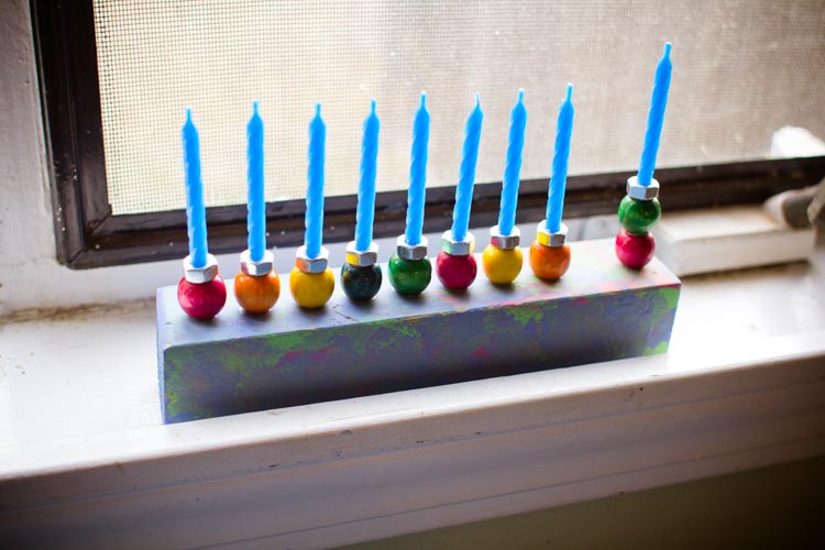 When the sun has set, twist a birthday candle into the elevated holder and also into the hex nut next to it. Light the “helper” candle first, then carefully use it to light the first candle. The second night, you’ll light 2 candles, then 3 on the third night, and so forth, until all 8 candles are lit.
