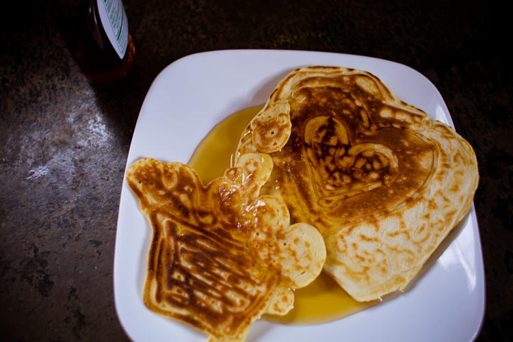 Once all of the pancakes are cooked, remove them from the oven and distribute them onto plates. Pour a generous drizzle of maple syrup over the top and enjoy surprising your birthday boy or girl.