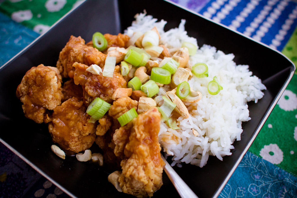 Plate the chicken with a scoop of rice, a few big spoonfuls of sauce, and a small handful of cashews and green onions.