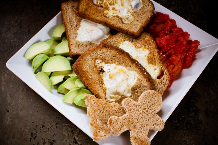 If you like an over-easy egg, remove your eggs in a poke from the heat, and arrange them on the platter. If you want your eggs a bit more cooked, flip the toasts once more—with confident conviction to keep the eggs from coming apart — and let the toast cook on the first side for about thirty more seconds. Again, plate your eggs up with the avocado and tomatoes.