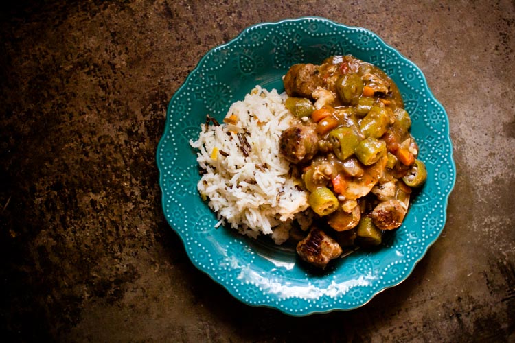 First, gumbo typically includes some form of seafood. I find that chicken and sausage are more than enough protein for my family, so I typically leave the seafood out. If you want to add it back in, I would substitute shrimp for some (or all) of the chicken.