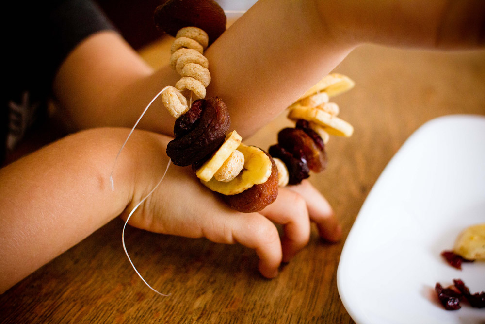 While you could use fresh fruit—think beautiful raspberry and blueberry jewels—our family stuck to dried so that our jewelry could be worn for awhile before eating.I also recommend using a large, metal yarn needle to string your jewelry. Not only does it prevent little hands from poking themselves with a sharp point, it has enough heft to get through even really sticky dried fruits without breaking.