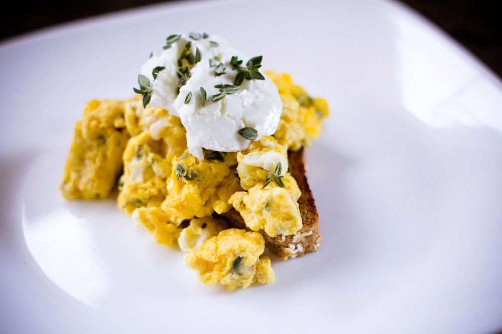 When the egg is firm all the way through, plate it up on a piece of toast. Top it with a few spoonfuls of thick, Greek yogurt, and garnish with a pinch more of chopped herbs sprinkled over the top.