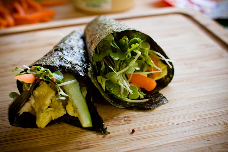 The recipe below contains all of the building blocks for a good nori hand roll—something sauce-like, a grain, a protein, and lots of fresh veggies—but feel free to substitute the specific ingredients for what you have onhand. Mashed avocado makes a great “sauce”, firm tofu or smoked salmon will work as a protein, and so forth.