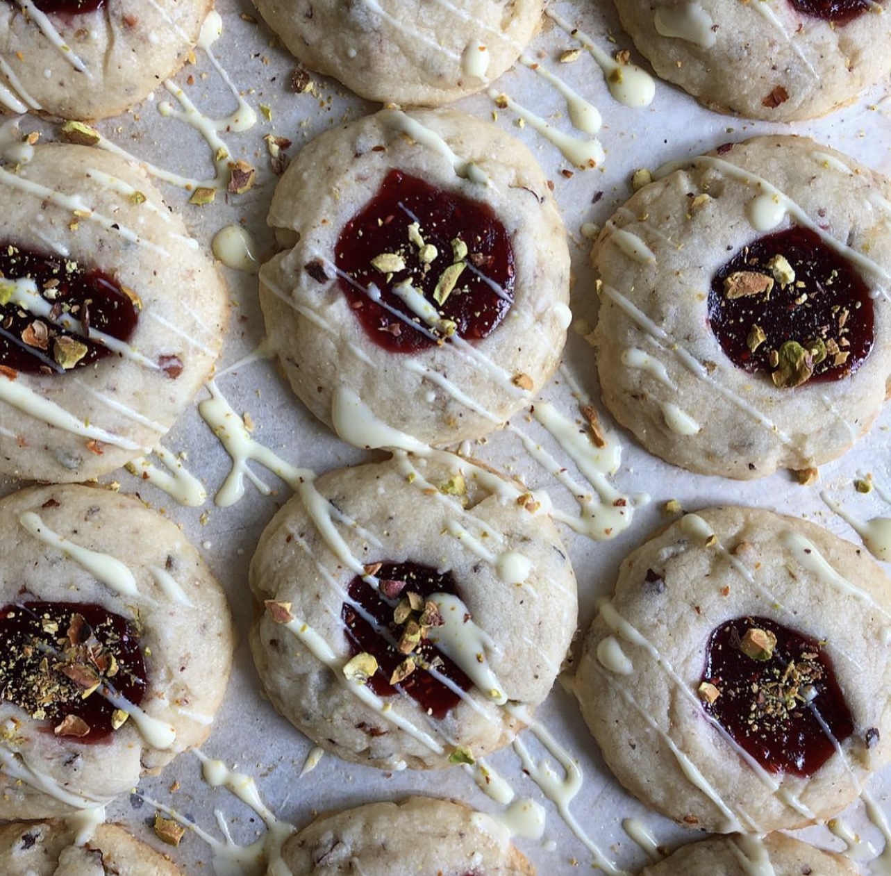 This is one of the prettiest cookies to make in no time at all. It couldn’t be more simple to do too! It takes five ingredients and just a few steps to create absolute deliciousness! My mom loves to bake and she would often make ghoraybeh, which is a Middle Eastern shortbread. Often, it is just topped with one pistachio for decoration. I decided to incorporate crushed toasted pistachios into the cookie itself to really bring out the flavor of pistachio which I have been recently loving! I took another step by modernizing this cookie into something we all know which are thumbprint cookies! I filled the indents with some yummy jam which you can buy or easily make your own.