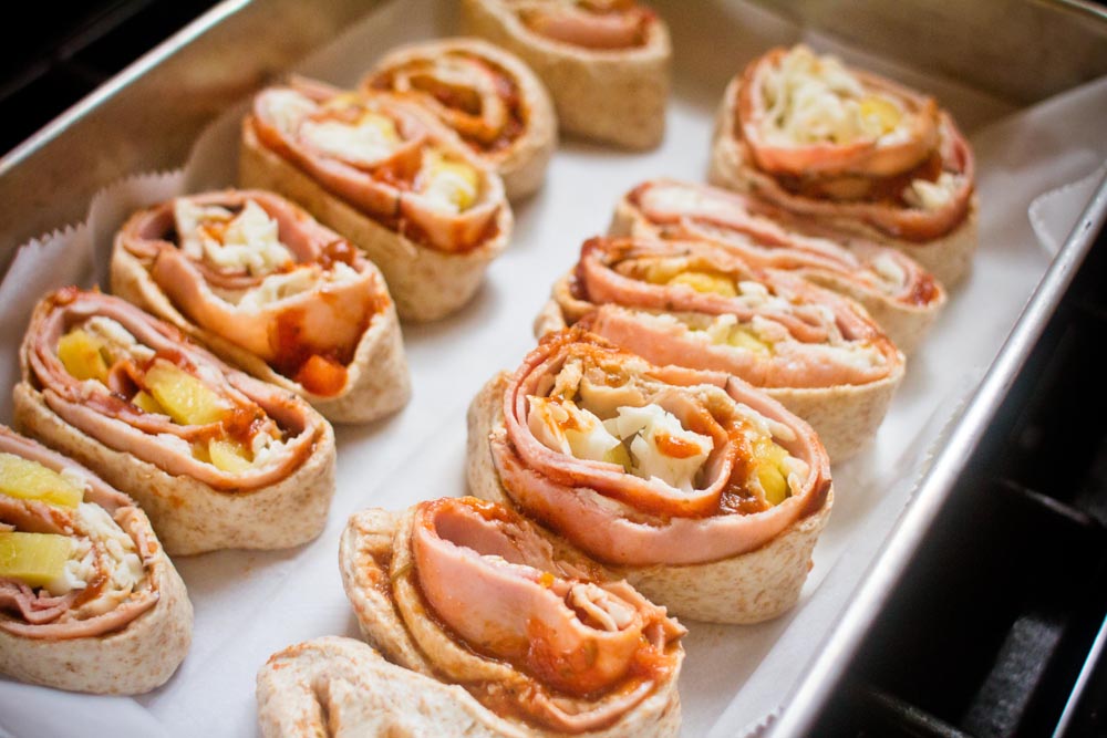 Roll out the pizza dough into a large rectangle on a cutting board. Spread the tomato sauce evenly over the top, then add the ham, shredded mozzarella, and pineapple chunks. Starting at one of the longer ends, roll the dough up—think like a cinnamon roll—and then use a sharp knife to cut the roll into about 2-inch segments.