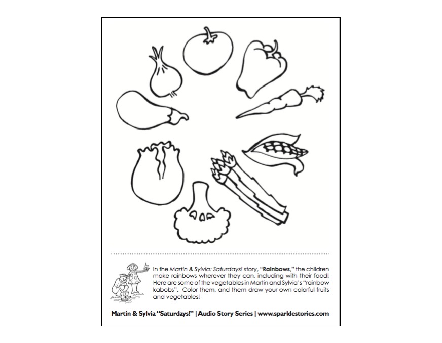 Here are some of the vegetables in Martin and Sylvia’s “rainbow kabobs”. Color them, and them draw your own colorful fruits and vegetables!